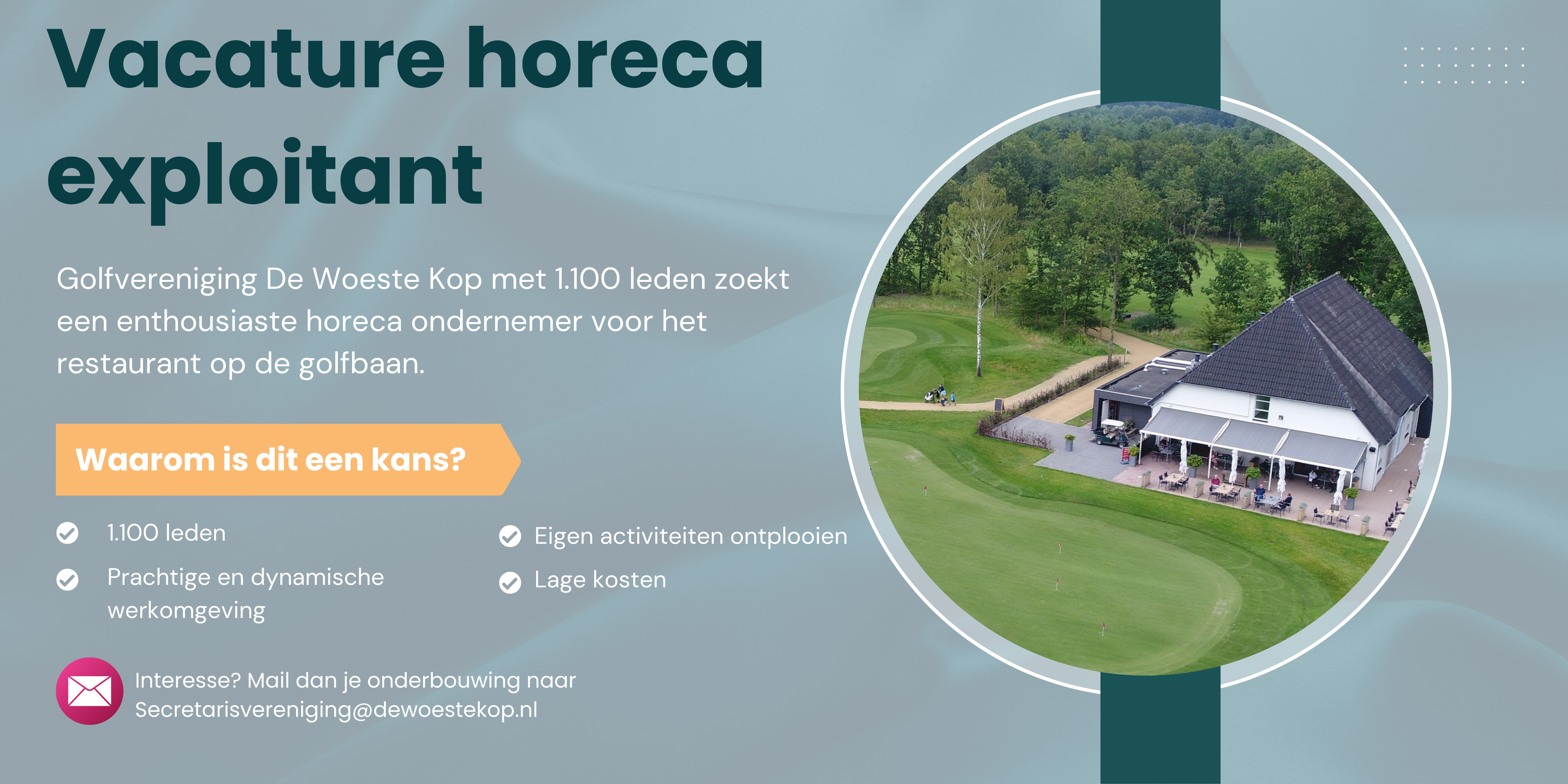 In verband met het aangaan van een nieuwe uitdaging van onze huidige exploitant, zijn wij als golfvereniging De Woeste Kop te Axel op zoek naar een nieuwe exploitant.
